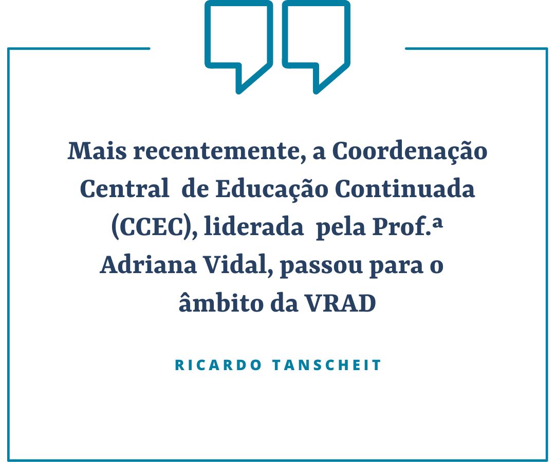 Mais recentemente, a Coordenação Central de Educação Continuada (CCEC), liderada pela Professora Adriana Vidal, passou para o âmbito da VRAD. Além de constituir uma vertente estratégica institucional de portfólio, a CCEC atua nos aspectos operacionais e financeiros dos cursos de especialização e de extensão, o que torna natural esse movimento. Cumpre lembrar que o seu setor de Tecnologia da Informação (TI) já se integrara à Vice-Reitoria de Infraestrutura e Serviços, como parte do processo de centralização das diversas equipes de TI disseminadas pela Universidade.