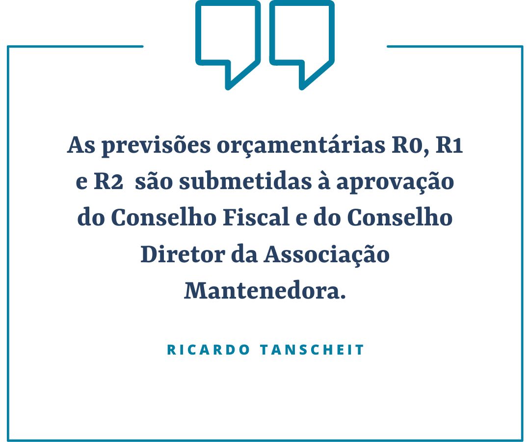 As previsões orçamentárias R0, R1 e R2 são submetidas à aprovação do Conselho Fiscal e do Conselho Diretor da Associação Mantenedora. A revisão R1 é apreciada também pela Assembleia da Associação Mantenedora, em conjunto com o balanço, de acordo com o estabelecido em estatuto.