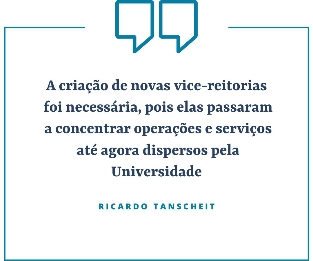 Ricardo Tanscheit: A criação de novas vice-reitorias foi necessária, pois elas passaram a concentrar operações e serviços até agora dispersos pela Universidade e alocados em uma ou outra vice-reitoria. Da ótica da Vice-Reitoria Administrativa, a criação da Vice-Reitoria de Infraestrutura e Serviços (VRIS) foi mais do que bem-vinda, pois ela é agora responsável pela estruturação gradativa do setor de Tecnologia da Informação (TI), que agrega os diversos serviços de sistemas de informação da Universidade, parte do quais estavam situados na VRAD (SGU). A antiga Superintendência Geral do Campus, outrora ligada à VRAD, passou também para o escopo da VRIS.