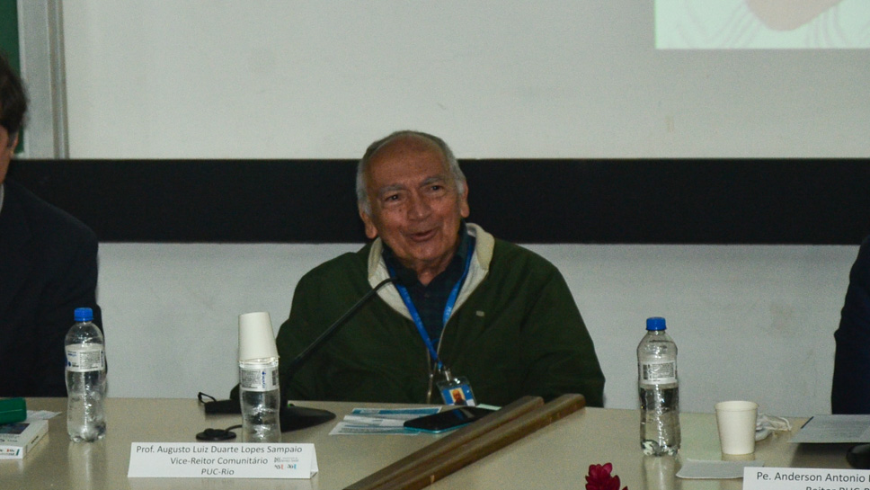 Após o recital, o Reitor, acompanhado do Vice-Reitor Acadêmico da PUC-Rio, professor José Ricardo Bergmann, do Vice-reitor para Assuntos Comunitários, professor Augusto Sampaio, e do Decano do Centro de Ciências Sociais, professor Francisco de Guimaraens, compôs a primeira mesa da cerimônia.