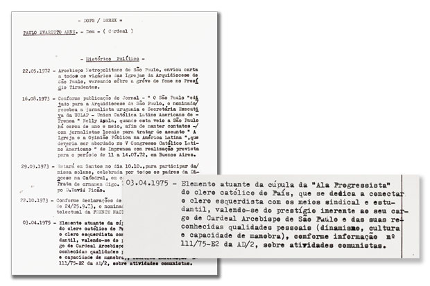 Considerado subversivo pelos militares, Dom Paulo acumulou 46 fichas no DOPS. Esses documentos se referiam à atuação do Arcebispo contra o regime e o acusavam de praticar atividades comunistas. Apesar do rastreamento, o Cardeal nunca foi tocado, embora tenha recebido ameaças por carta e telefone. Como Arcebispo de São Paulo, qualquer sanção teria repercussão internacional. Segundo Ricardo Carvalho, autor da biografia O Cardeal da Resistência – as muitas vidas de Dom Paulo Evaristo Arns, tal intangibilidade também se deve ao medo que os militares tinham.