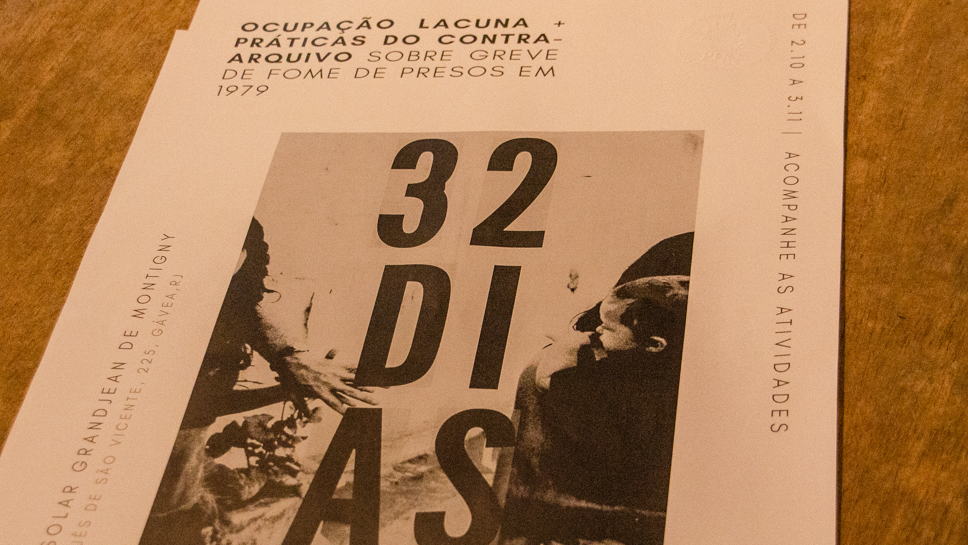 Para lembrar o ato ousado, os coletivos Lacuna (Laboratório de Artes, Literatura e Contemporaneidade a Partir de Arquivos) e o Contra-Arquivo, grupo de pesquisa em imagens, coordenado pela professora do Departamento de Comunicação Patrícia Machado resolveram agir. Os grupos inauguraram a montagem intitulada “32 dias: a greve de presos em 1979”, no Solar Grandjean de Montigny, no dia 4 de outubro. A mostra ficará em cartaz no mesmo número de dias do protesto na penitenciária.