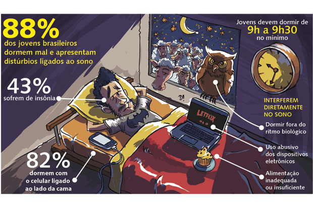 Um estudo organizado pelo Instituto de Pesquisa e Orientação da Mente (Ipom) revelou que 88% dos jovens brasileiros dormem mal e apresentam distúrbios ligados ao sono, e 43% sofrem de insônia. A pesquisa mostra também que 82% dos jovens dormem com o celular ligado ao lado da cama.