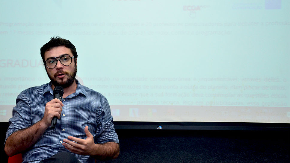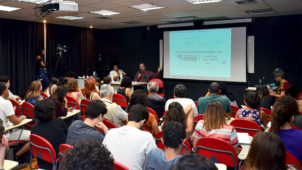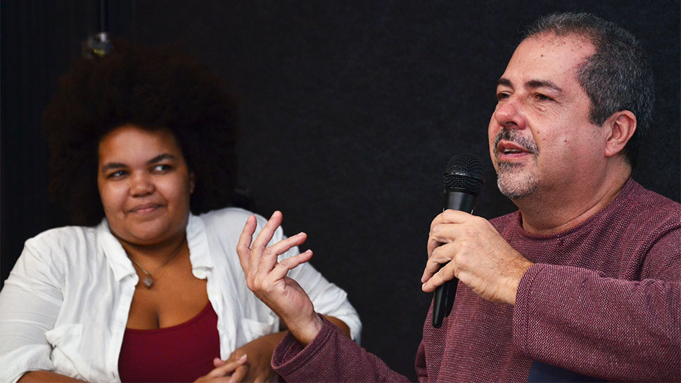 Repórter especial Chico Otávio, do jornal O Globo, e a repórter Lola Ferreira, do site Gênero e Número, discutiram o processo de apuração de dados e fontes no jornalismo, mediado pelo professor Sérgio Mota, do Departamento de Comunicação Social. Otávio ressaltou o jornalismo de dados como um caminho baseado na procura, na movimentação de redes e de personagens. Segundo ele, a relação com às fontes deve ser construída a partir da confiança mútua e o respeito com a informação.