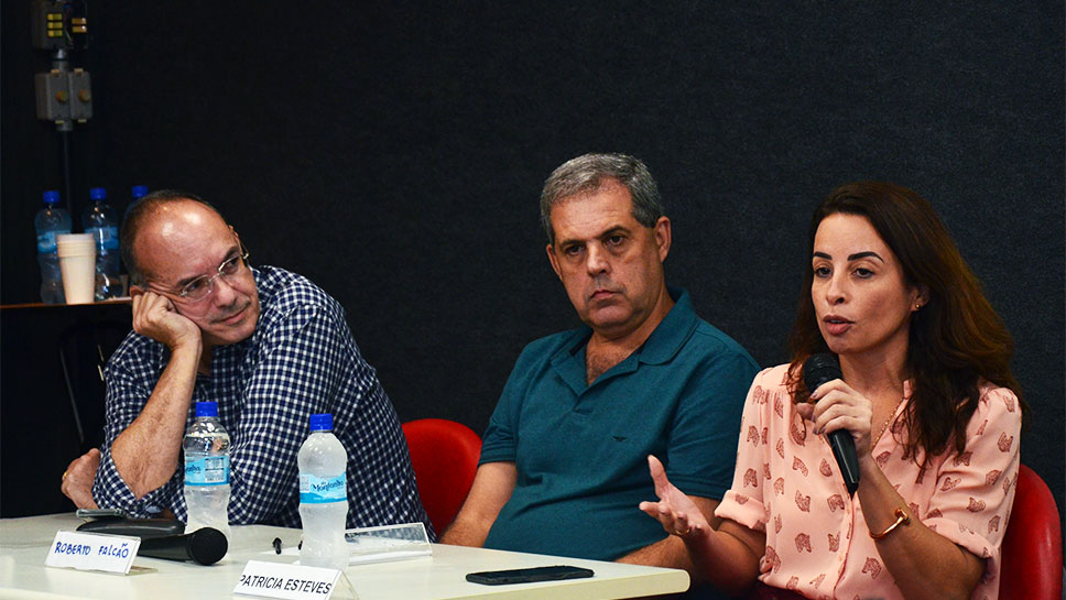 O lugar do entretenimento no jornalismo esportivo, a interatividade do digital e o limite entre o humor e a credibilidade informativa foram os temas abordados na palestra sobre o esporte em multiplataformas na Semana do Jornalismo, no dia 30 de maio. A mesa, mediada pelos professores de Comunicação Social Alexandre Carauta e Luiz Léo, contou com a presença da diretora de Marketing da Fox Sports, Patrícia Esteves, do comentarista da SporTV Lédio Carmona, do gerente de conteúdo e produção no Viu Hub, Allan Lico, e do especialista em marketing esportivo Roberto Falcão.