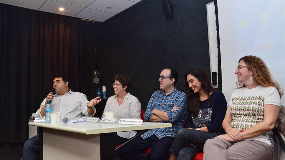 No segundo dia da Semana de Jornalismo da PUC-Rio, a mesa Podcast discutiu o futuro da nova plataforma e o modo de se fazer jornalismo por meio dela. Participaram do debate a produtora Paula Scarpin, dos podcasts Maria Vai com as Outras e Foro de Teresina; a apresentadora, roteirista e produtora Gabriela Viana, do podcast Vozes: Histórias e Reflexões; o apresentador Rodrigo Alves, dos podcasts 2 Pontos e Vida de Jornalista; e a professora Patrícia Maurício, do Departamento de Comunicação Social PUC-Rio. O encontro foi mediado pelo professor Soares Junior, do Departamento de Comunicação Social, membro do podcast E Agora, José?.