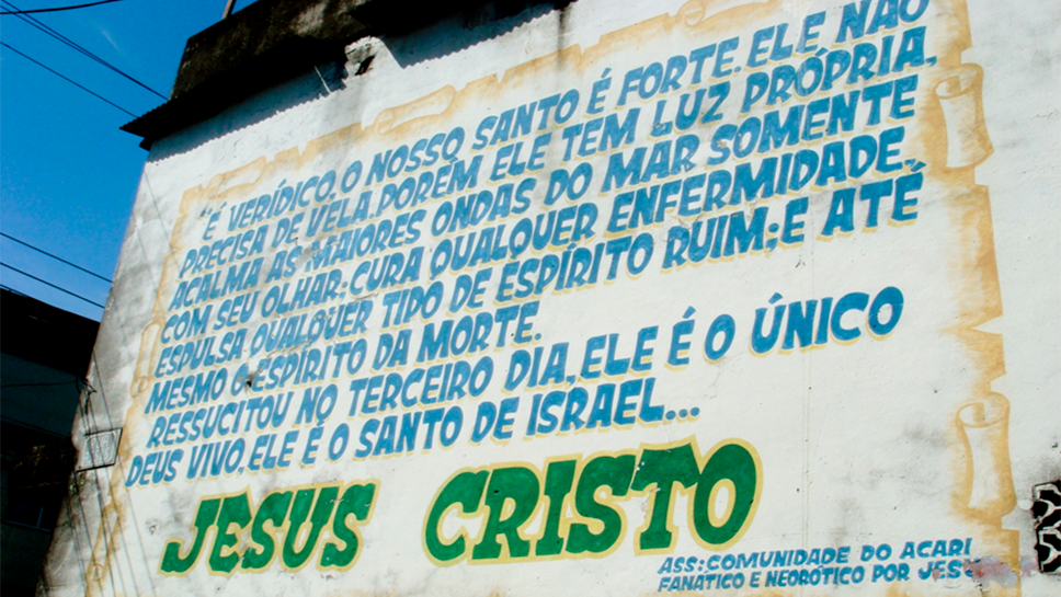 Christina contou que nos grafites de Acari ícones eram destruídos para adotar uma nova estética que remetia à religião pentecostal, como o formato de papiro, a fonte Old English e o uso de uma gramática que optava por palavras como batalha, guerra espiritual e confirmação. Os principais pontos da cultura pentecostal nas periferias, segundo a professora, são a valorização do empreendedorismo e da disciplina para o sucesso, a noção de que o esforço pessoal produz vitórias e uma valorização moral da família e de papéis de gênero definidos entre homens e mulheres.