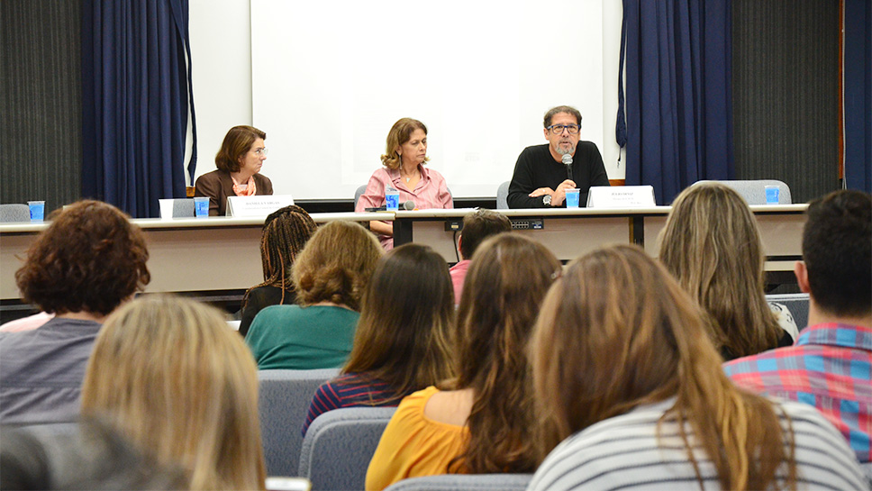 Intolerância: gênero, raça e religião foi o tema do III Fórum Ensino Superior e Ciências Humanas. A abertura começou com o discurso da Coordenadora Central de Graduação, professora Daniela Vargas, e do Decano do Centro de Teologia e Ciências Humanas (CTCH), professor Júlio Diniz. No encontro, Daniela expressou a importância do professor ao assumir papel de mediador, que gera o diálogo e a reflexão crítica, enquanto Diniz registrou todos e quaisquer atos dentro de Universidade como de resistência. A mediação foi da vice-decana de graduação do CTCH, Cristina Carvalho.