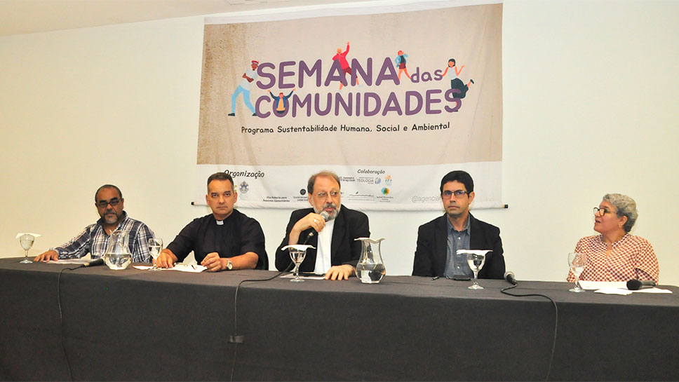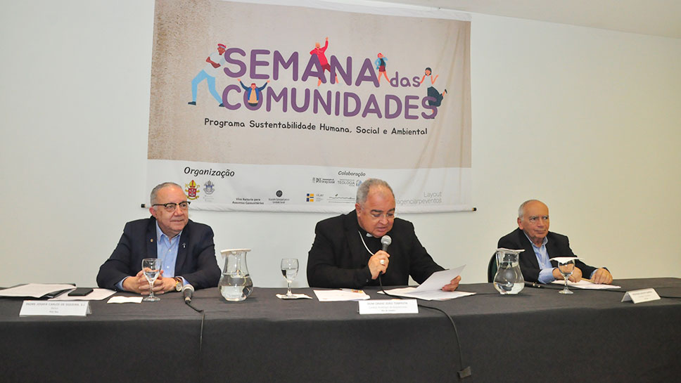 A PUC-Rio e a Arquidiocese de São Sebastião do Rio de Janeiro promoveram a 1ª Semana das Comunidades entre os dias 23 e 27 de setembro. O tema da edição foi Programa Sustentabilidade Humana, Social e Ambiental. A programação englobou mesas, rodas de conversa, oficina e uma exposição fotográfica, que ocorreram no Campus Gávea da PUC-Rio. Na solenidade de abertura, estiveram presentes o Arcebispo da Arquidiocese do Rio de Janeiro e Grão-Chanceler da PUC-Rio, Cardeal Orani João Tempesta, O. Cist., o Reitor da Universidade, Padre Josafá Carlos de Siqueira, S.J., e o Vice-Reitor Comunitário, professor Augusto Sampaio.