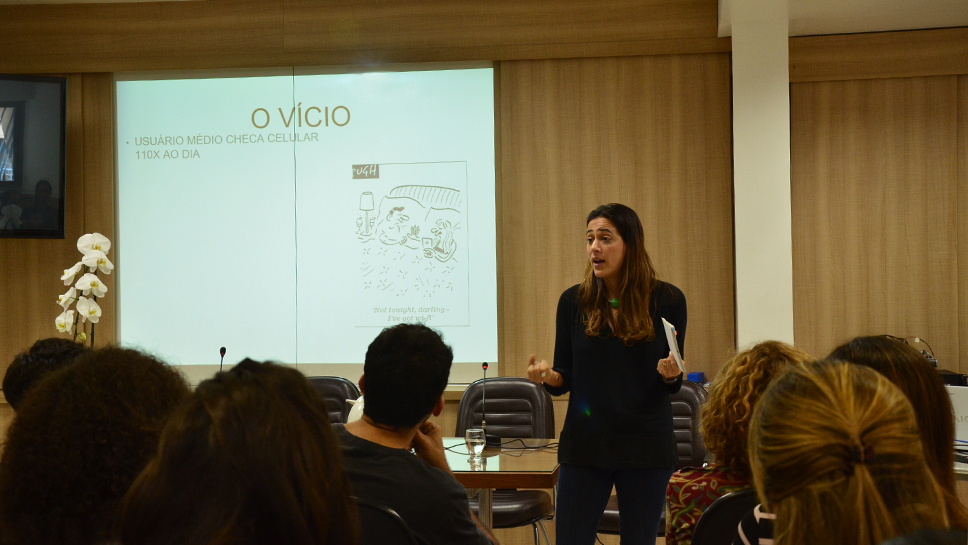 A convidada expôs dados estatísticos para demonstrar o vício tecnológico. De acordo com ela, o usuário médio checa o celular 110 vezes ao dia, as crianças ficam, em média, 6h40 diárias nas telas, e uma a cada oito pessoas, apresenta o vício.