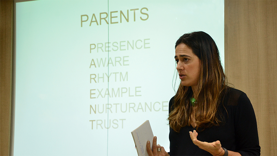 A jornalista completou ao exemplificar o que ocorre com as crianças: o nível de dopamina sobe no instante das brincadeiras, mas diminui conforme a diversão chega ao fim. Segundo a palestrante, os pequenos só recebem dopamina quando expostos às telas dos celulares e vídeo games. No momento em que os pais tiram o aparelho, comentou a palestrante, o filho estressa porque as taxas estão muito altas e, assim, o metabolismo fica desregulado.