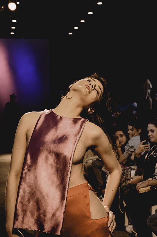 Outra característica do desfile foi a passarela no chão. A professora contou que a intenção desse formato é aproximar os designs do público e acabar com a concepção glamourizada dos desfiles. Ela afirmou que o departamento busca que a Semana de Design seja cada vez mais protagonizada pelos alunos e explicou que a temática forte individual de cada designer foi o que motivou a decisão de organizar a mostra em blocos, com as criações de cada um.