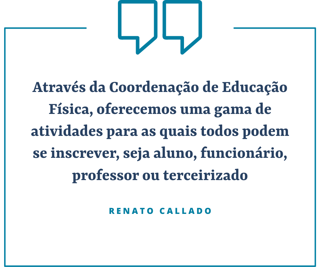 Renato Callado: Esporte é saúde, integração, pertença, enfim, traz qualidade de convivência. Através da Coordenação de Educação Física, oferecemos uma gama de atividades para as quais todos podem se inscrever, seja aluno, funcionário, professor ou terceirizado. É importante ressaltar que reservamos vagas aos alunos bolsistas que podem fazer a atividade sem custo. Entendemos a atividade física como ferramenta para o desenvolvimento e integração saudável da comunidade, sempre buscando o equilíbrio entre o corpo e a mente. O educador físico, como um agente de saúde e formador de opinião, tem um papel importante na manutenção de hábitos saudáveis e na rotina da vida de seus alunos. Quando encontro ex-alunos que compreenderam a importância da atividade física a partir das vivências que tiveram na Universidade e continuaram a praticar em suas rotinas, entendo que atingimos nosso objetivo. Uma das atividades que exerci dentro da PUC, dando aulas de natação, me trouxe belos presentes. Explico: quando iniciava um semestre com algum aluno, professor ou funcionário que nunca tinha tido a oportunidade de fazer uma aula de natação, ou tinha medo, e que terminava o semestre sabendo nadar, dizendo que finalmente teve coragem de dar o mergulho na praia ou entrar com o filho na piscina, isso me trazia uma felicidade imensa. É uma lembrança e afeto que vou levar para o resto da vida.
