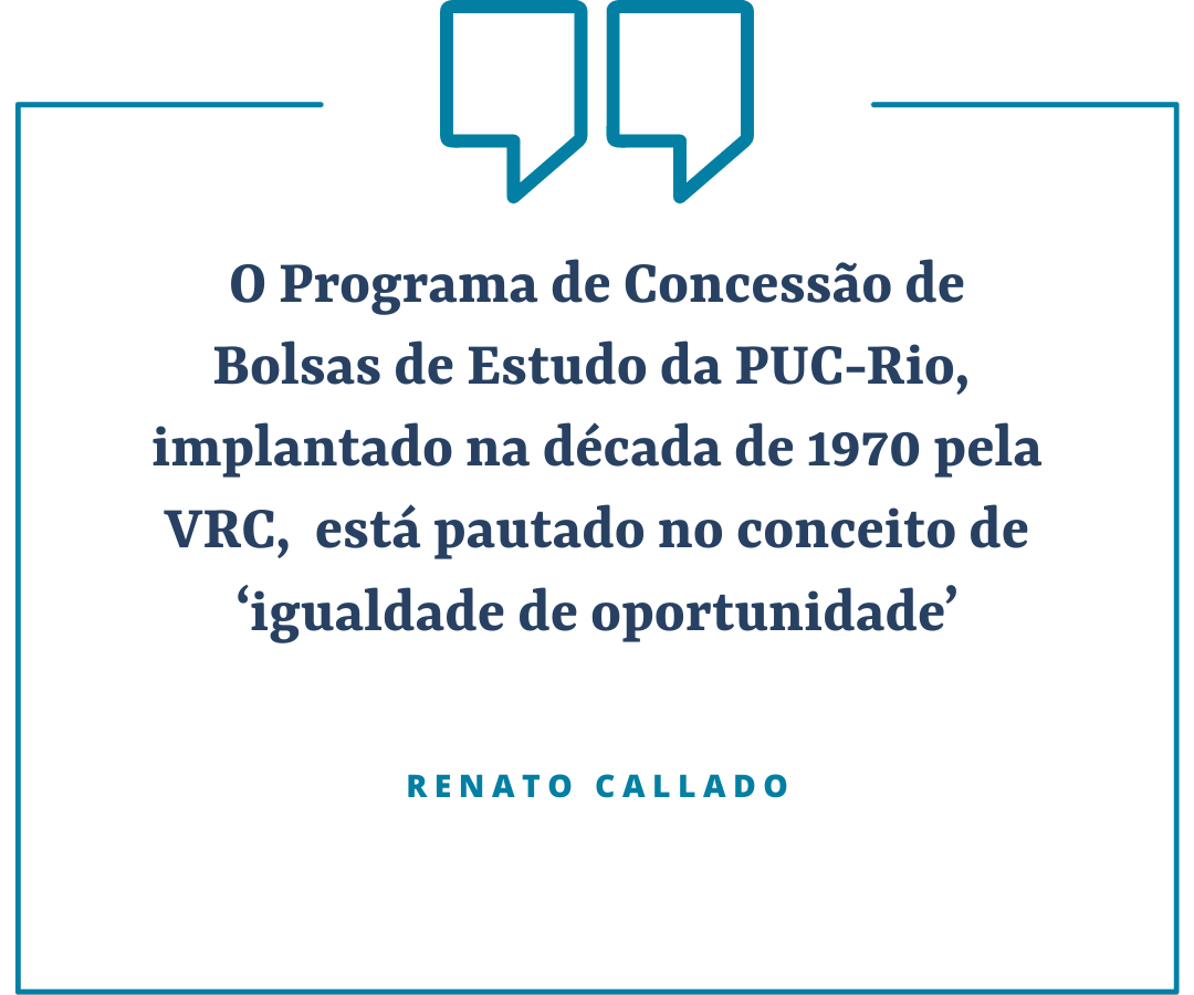 Renato Callado: O Programa de Concessão de Bolsas de Estudo da PUC-Rio, implantado na década de 1970 pela Vice-Reitoria, está pautado no conceito de "igualdade de oportunidade". Desde sua implantação, foram feitos esforços diferenciados na esfera comunitária, com o propósito de aprimoramento e atendimento às demandas advindas das mudanças no cenário da educação de nível superior.