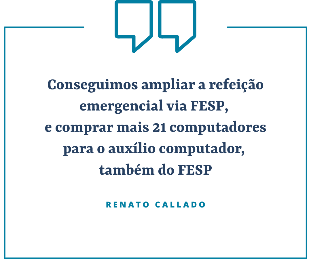 E aproveitando a economia realizada, já que não mais será necessário alugar computadores, contratar mesários, nem pagar hora-extra, por exemplo, aos nossos funcionários anteriormente deslocados para a votação, conseguimos ampliar a refeição emergencial via FESP, e comprar mais 21 computadores para o auxílio computador, também do FESP.