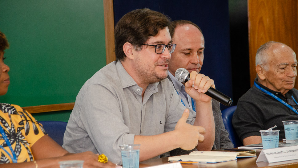 A professora Valéria Pereira Bastos, do Departamento de Serviço Social, o professor Augusto Sampaio, a vereadora Monica Benicio (PSOL-RJ), o Diretor Executivo da Educafro, Frei David, o assessor especial da Reitoria para a Formação em Identidade e Missão, Padre José Abel de Sousa, S.J. e o Decano do Centro de Ciências Sociais (CCS), professor Francisco de Guimaraens estavam na mesa da comemoração.