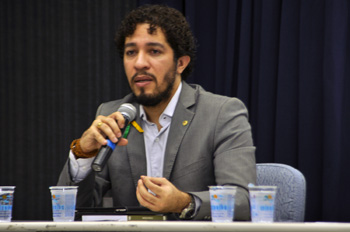 O deputado federal Jean Wyllys (PSOL-RJ) veio à PUC, no dia 14 de maio, para participar de uma mesa-redonda, realizada no Auditório Padre Anchieta, com o tema Agenda LGBT no Congresso. Gisele Cittadino, professora do Departamento de Direito, coordenou o debate, que também contou com a participação de Paulo D’Avila Filho, professor do Departamento de Ciências Sociais.
