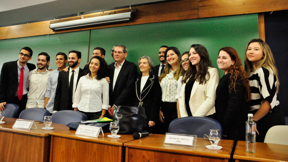 Os professores do Departamento de Direito Florian Hoffman e Rogério Nascimento fizeram os agradecimentos à ministra, lembrando a tradição da PUC no Direito Constitucional, na graduação e pós. O Cael foi representado pelos alunos Bernardo Mattos, Matheus Tavares e Bruno Cardoso.