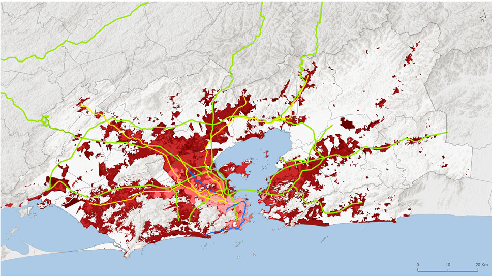 Estremida entre a Serra do Mar e o Atlântico, a area metropolitana do Rio viveu uma expansão territorial de forma espraiada. O movimento acompanha os eixos rodoviários áreas rurais adentro, para Leste e Oeste, esticando o que os técnicos chamam de mancha urbana. Organizá-la para melhrar a vida na metrópole é um dos objetivos das pesquisas e levantamentos conduzidos pelo Plano de Desenvolvimento, disponíveis na página eletrônica do PDIU.