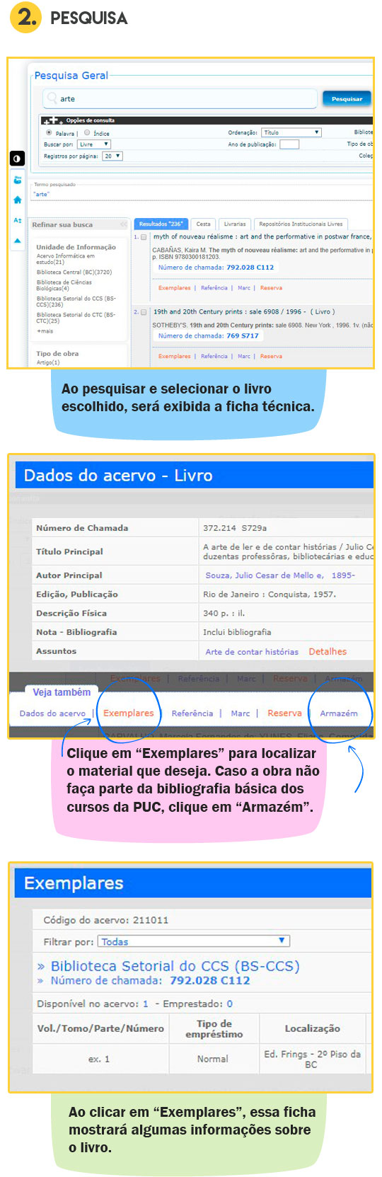 A pesquisa de qualquer livro deve ser feita pelo site da biblioteca www.dbd.puc-rio.br. Existem também totens de pesquisa dentro da sala de estudo individual para a consulta dos exemplares.
