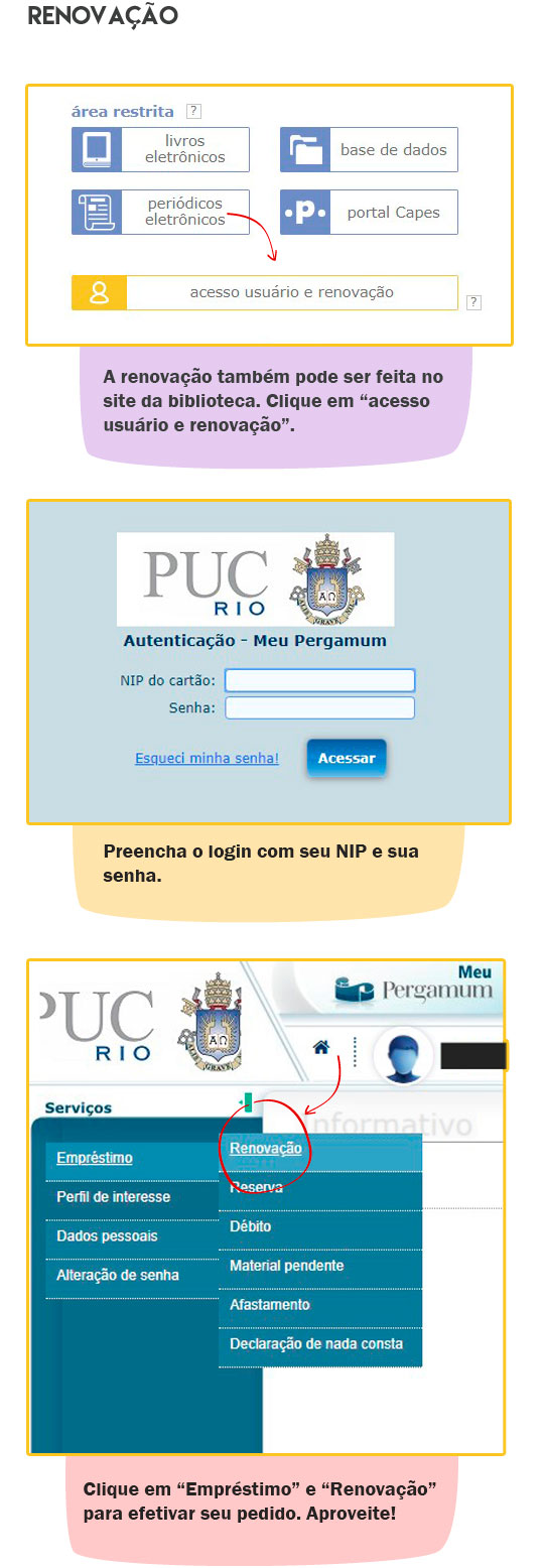 Os empréstimos costumam durar cerca de sete dias úteis. A renovação pode ser feita tanto no balcão de atendimento quanto no site da biblioteca. Tenha cuidado ao manusear as obras, pois outras pessoas vão utilizá-las também.