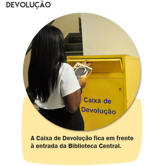 A devolução do exemplar pode ser feita pela Caixa de Devolução, como também pelo balcão de atendimento.