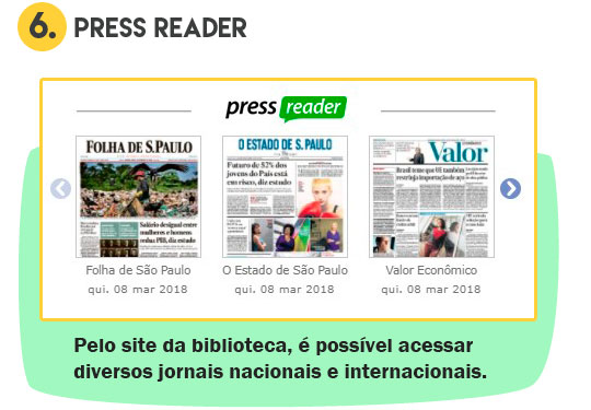 Pelo site da biblioteca, é possível acessar aos jornais nacionais Folha de S.Paulo, O Estado de S.Paulo, e Valor Econômico. Também é possível encontrar os jornais internacionais Clarin, The Washington Post e The Guardian.