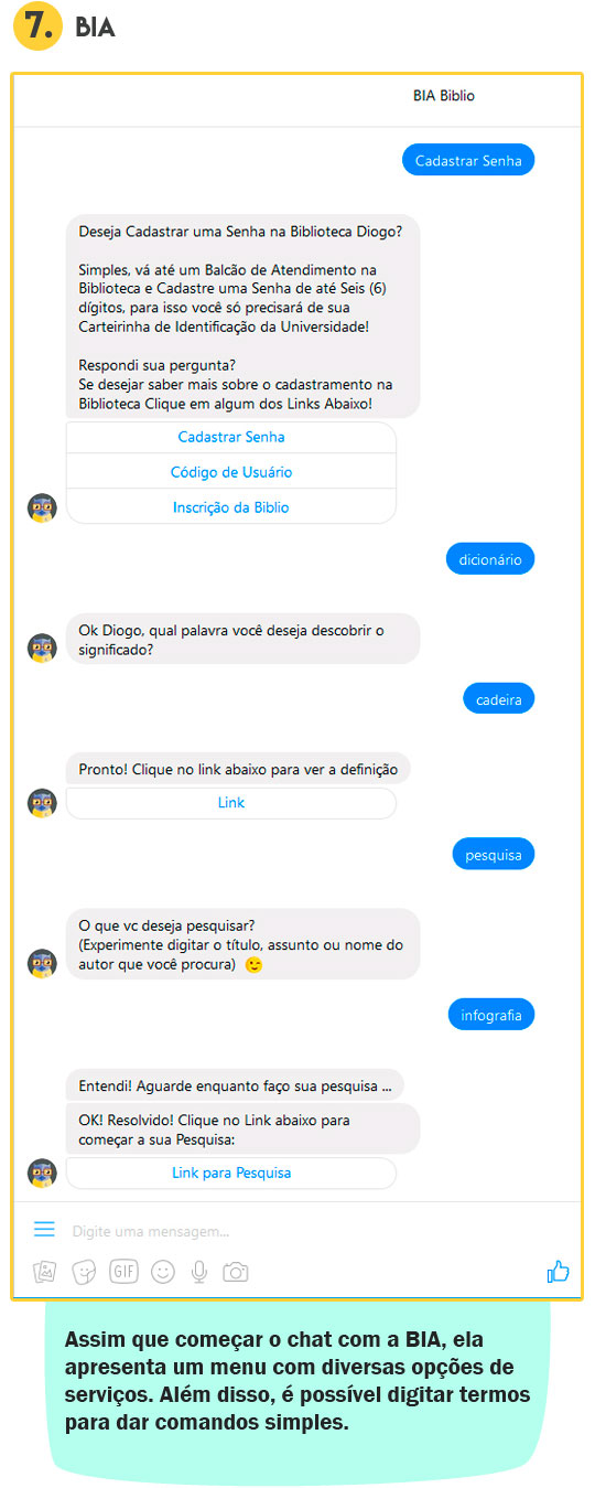 A assistente virtual BIA (Bibliotecária Interativa Automatizada) foi criada para facilitar o acesso digital do usuário da Biblioteca. Ela deve ser acessada pela página https://www.facebook.com/falecomBia.