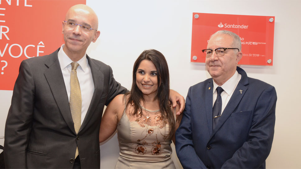 O primeiro espaço de coworking do Santander Universidades no Rio de Janeiro – e o quinto no Brasil - foi inaugurado ontem, dia 12. O novo ambiente, que fica nos pilotis, na Ala Frings, tem como objetivo dar outro significado para uma agência tradicional e construir um vínculo com mais afinidade entre alunos e o banco. Para a inauguração estiveram presentes o Reitor da PUC-Rio, padre Josafá Carlos de Siqueira, S.J. e o atual presidente do Banco Santander, Sérgio Rial.